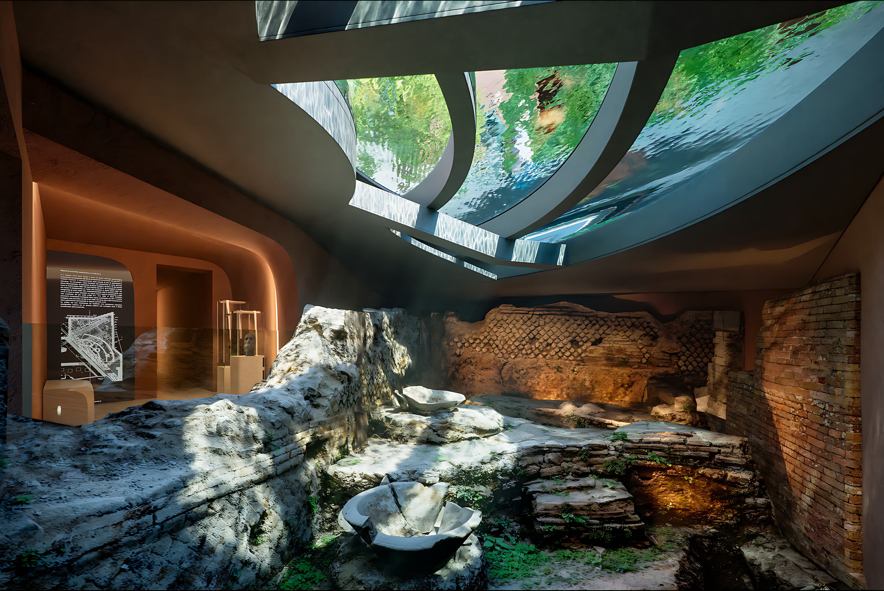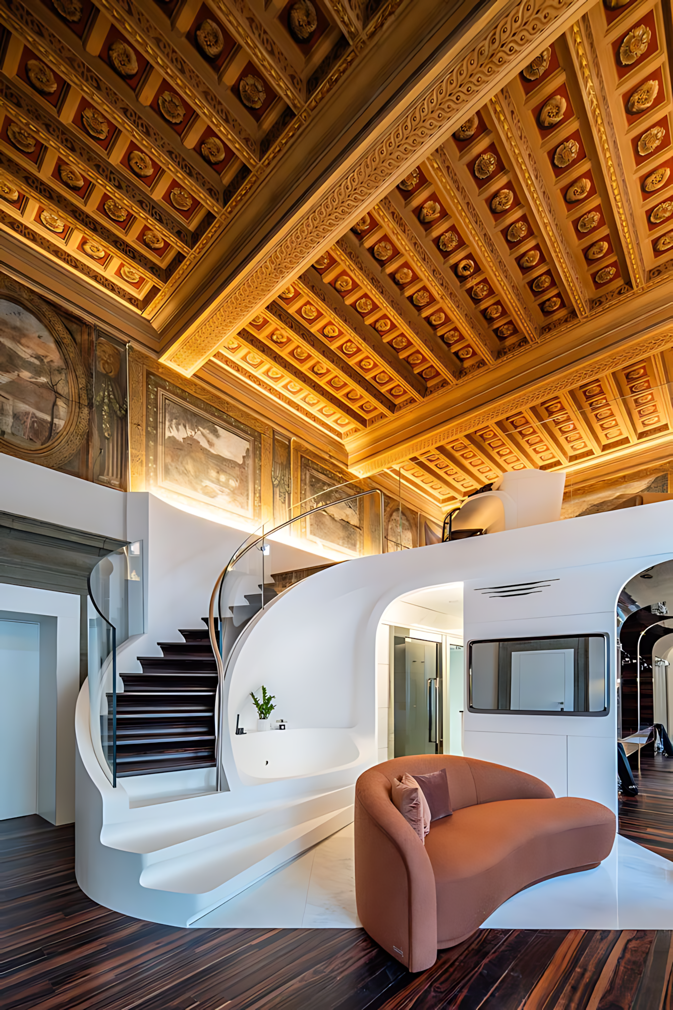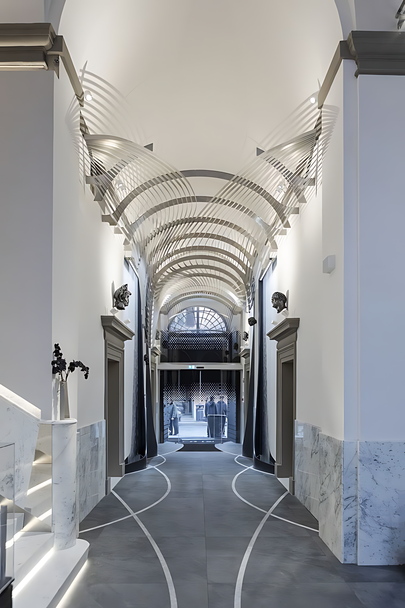 로마를 건축의 중층 구조(르네상스와 중세 건축물 위에 바로크 건축이 겹치고, 그 위에 로마 건축이 겹치는)으로 고전적으로 해석하면, 수직성의 최종층, 즉 트롬프 루이유의 아치가 그려진 천장, 천공의 둥근 천장, 승천하는 성인, 순교자, 푸토로 가득 채워진 하늘의 방이 포함된다. 자하 하디드는 경력의 시작부터 건물을 공중에 배치하고, 그림자, 빛, 그리고 공간의 이음새 위에 건물을 띄우고, 그 볼륨을 지상에 들어 올리고, 자신의 작품을 다른 전통, 즉 로마의 전통과 관련이 있었다. 하디드와 그녀를 앞두고 있는 르네상스와 바로크의 로마 건축가들은 공기, 하늘, 천국을 지향했다. 포폴로 광장에서 방사형으로 늘어나는 시스티나의 삼차로의 분기인 리페타 거리를 따라 있는 팔라초 카포니의 호텔 개조 설계에 즈음해, 하디드와 파올라 카타린이 이끄는 자하 하디드 아키텍츠(ZHA)의 팀은 바로크 건축가가 파린프세 즉, 아치형 천장에서 착수했습니다.