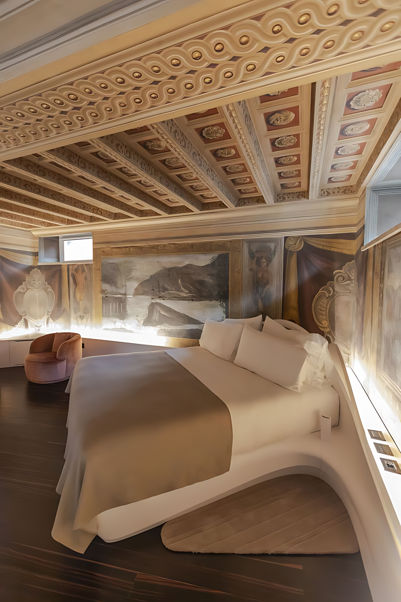 The classical interpretation of Rome as a palimpsest of architectural layers—Baroque buildings atop Renaissance and medieval structures, themselves atop their Roman predecessors—includes a final layer of verticality: ceilings of painted trompe l'oeil arches, heavenly vaults, and celestial chambers populated with ascendant saints, martyrs, and putti. From the very beginning of her career, Zaha Hadid sited her buildings in the air, floating buildings on shadow, light, and seams of space that lifted volumes above the ground, relating her work to another tradition—Rome's. Hadid, and the city's architects of the Renaissance and Baroque that preceded her, aspired to the air, the skies, and the heavens. In designing the hotel conversion of the Palazzo Capponi, on the Via di Ripetta, a branch of the city's Sistine Trident radiating from the Piazza del Popolo, Hadid and her team at Zaha Hadid Architects (ZHA) led by Paola Cattarin, started where Baroque architects ended their palimpsest—at the vaulted ceilings.